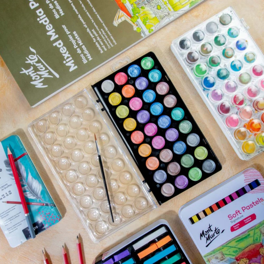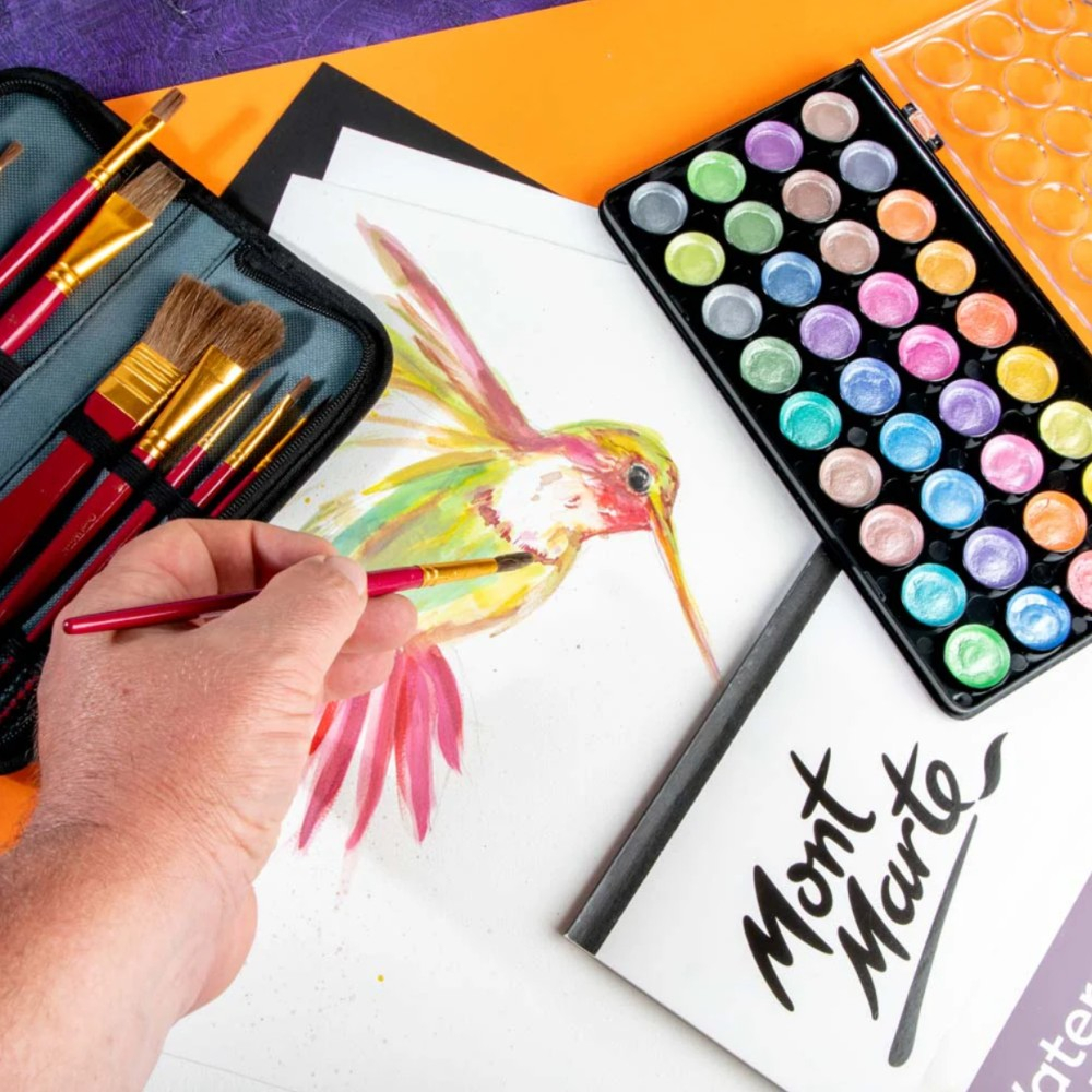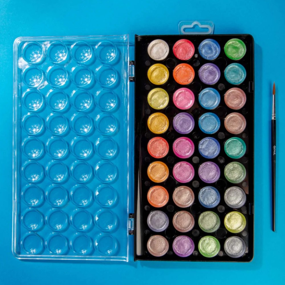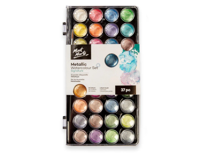 Lasă-ți imaginația să strălucească cu Acuarelele metalizate Mont Marte - Cake Set 37 buc! Un set generos, cu nuanțe sidefate și perlate care oferă reflexii spectaculoase, perfecte pentru picturi deosebite, ilustrații, journaling, carduri sau artă decorativă._x000D_ _x000D_ Conține 36 de culori vibrante + 1 pensulă cu rezervor de apă, toate într-o cutie practică, ideală pentru călătorii sau utilizare la birou și acasă. Se activează ușor cu apă, oferind o aplicare fluidă și o acoperire spectaculoasă pe hârtie._x000D_ _x000D_ Perfect pentru artiști de toate vârstele care vor să adauge un plus de magie lucrărilor lor!