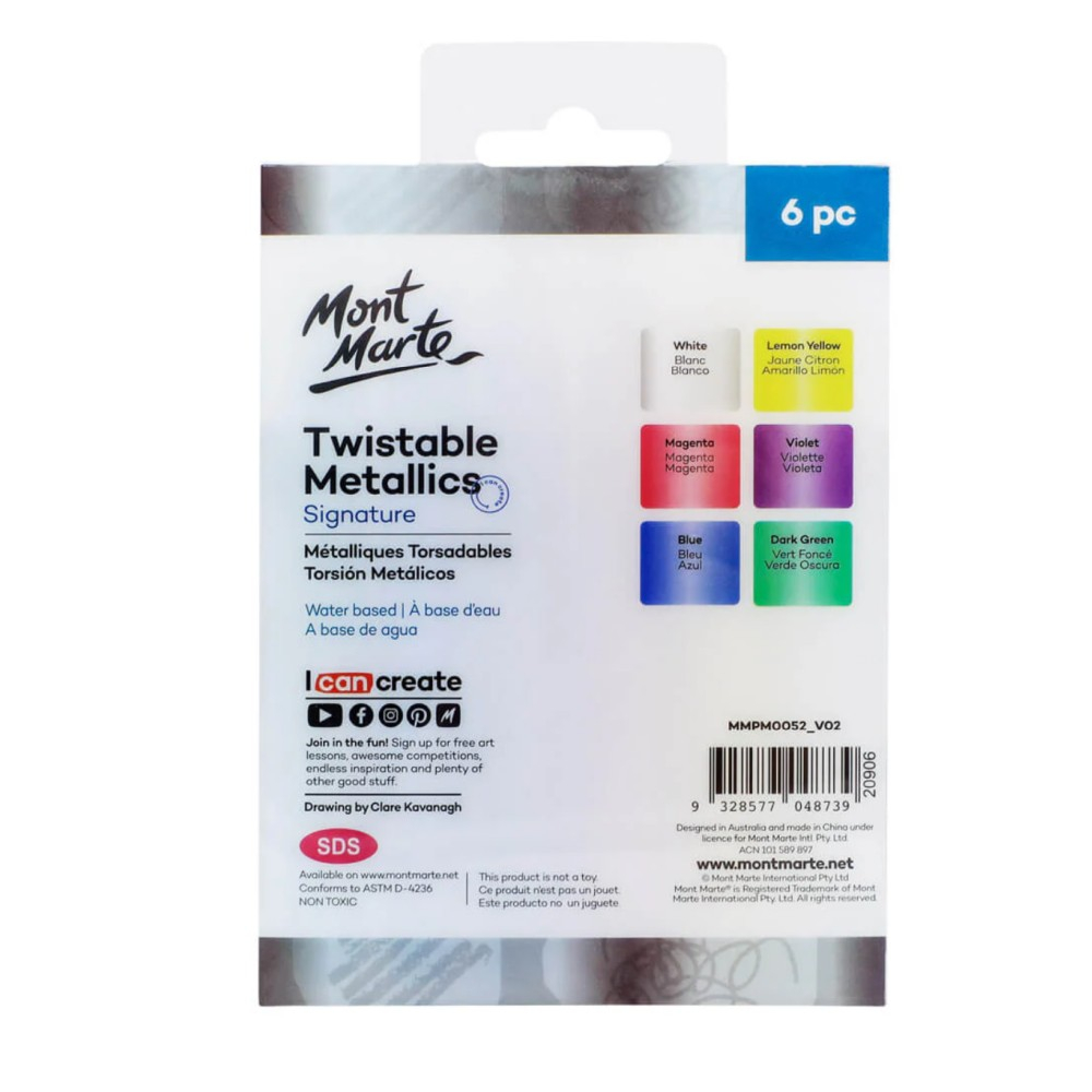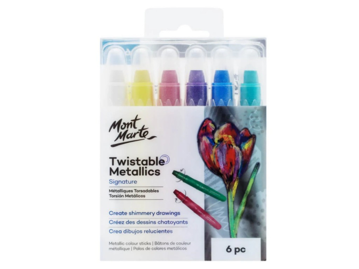 Creioane retractabile metalizate Mont Marte, 6 bucăți (cunoscute și ca Twistable Metallics Signature 6pc) - stick-uri gel retractabile cu efect metalic strălucitor, perfecte pentru coloring, layering și efecte shimmer!_x000D_ Acest set aduce un plus de farmec și sclipire în orice proiect artistic!_x000D_ Fiecare creion retractabil (twist-up) oferă un stick gel gros de 10 mm, cu finisaj metalic translucid - ideal pentru a crea efecte de layering, amestecuri noi de culori și suprafețe mari colorate rapid și uniform!_x000D_ Culorile vibrante metalice: Alb (White), Galben lămâie (Lemon Yellow), Magenta intens, Violet regal, Albastru profund și Verde închis (Dark Green) - toate cu shimmer irezistibil!_x000D_ _x000D_ De ce acest set va deveni preferatul tău?_x000D_ - Șase culori metalice strălucitoare- White, Lemon Yellow, Magenta, Violet, Blue, Dark Green cu efect shimmer superb!_x000D_ - Design retractabil ușor - răsucește și folosește fără ascuțitoare, mereu ascuțit și gata de creat!_x000D_ - Stick gros de 10 mm - acoperă rapid zone mari, perfect pentru coloring books sau proiecte mari!_x000D_ - Finisaj translucid - permite suprapuneri magice și crearea de nuanțe noi prin layering!_x000D_ - Blendabil și smooth - alunecă ușor pe hârtie, cu textură fină și grip texturat pentru confort maxim!_x000D_ - Non-toxice și practice - ideale pentru copii 6+ ani, artiști hobby sau școală - lavabile de pe mâini!_x000D_ _x000D_ Perfect ca un cadou sclipitor pentru pasionații de artă, coloring sau craft-uri cu efect wow! Transformă desenele obișnuite în creații strălucitoare și pline de magie!_x000D_ Achiziționează acum și adaugă strălucire magică creațiilor tale!