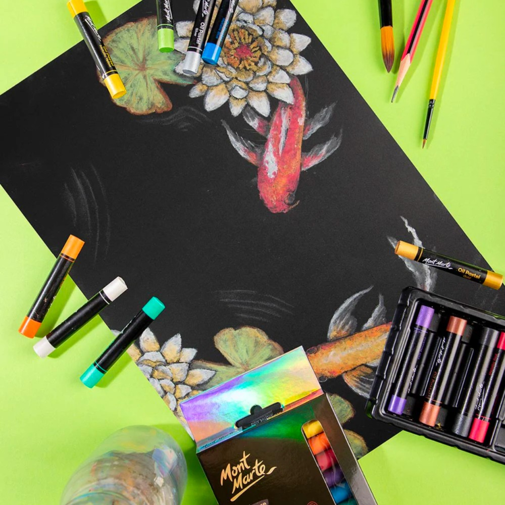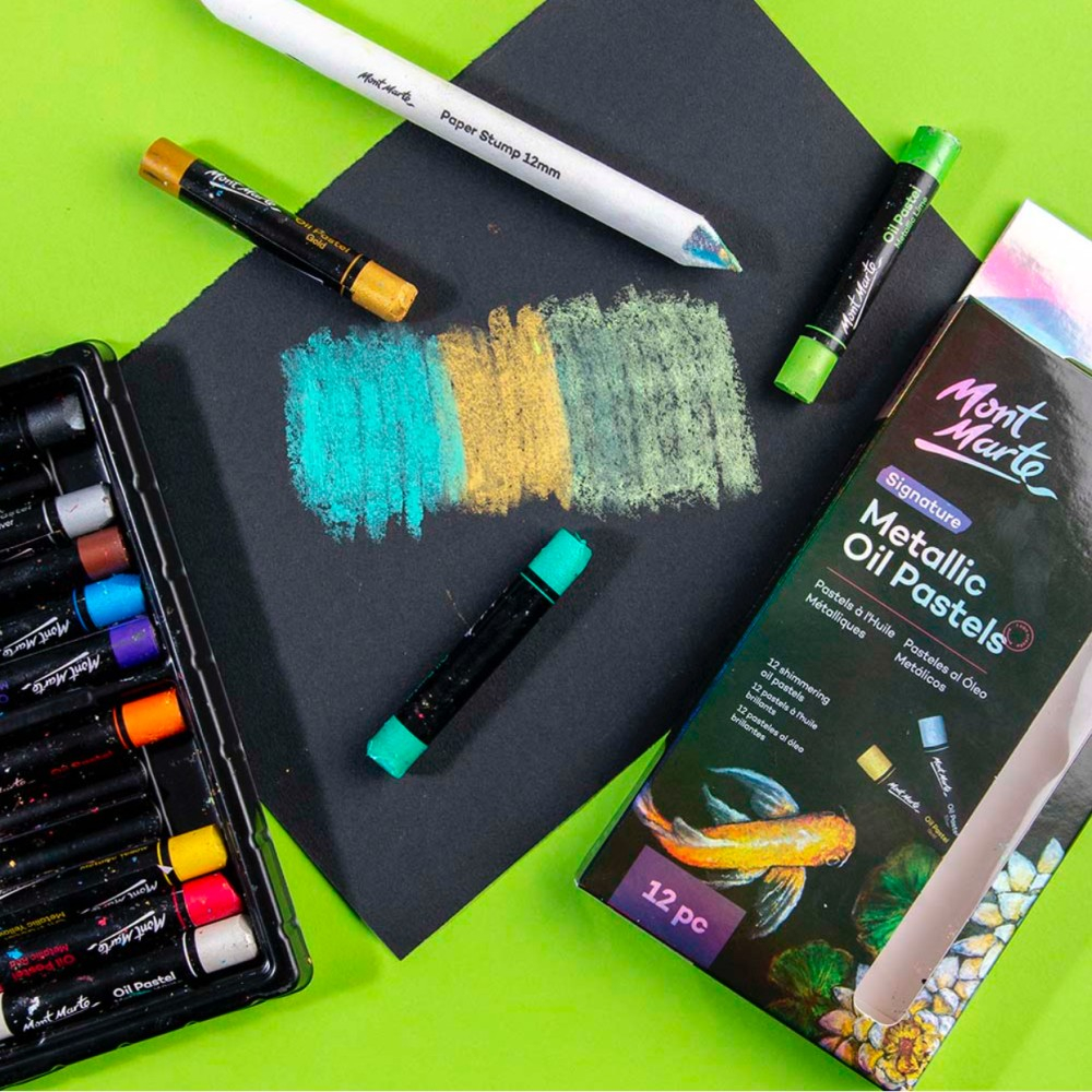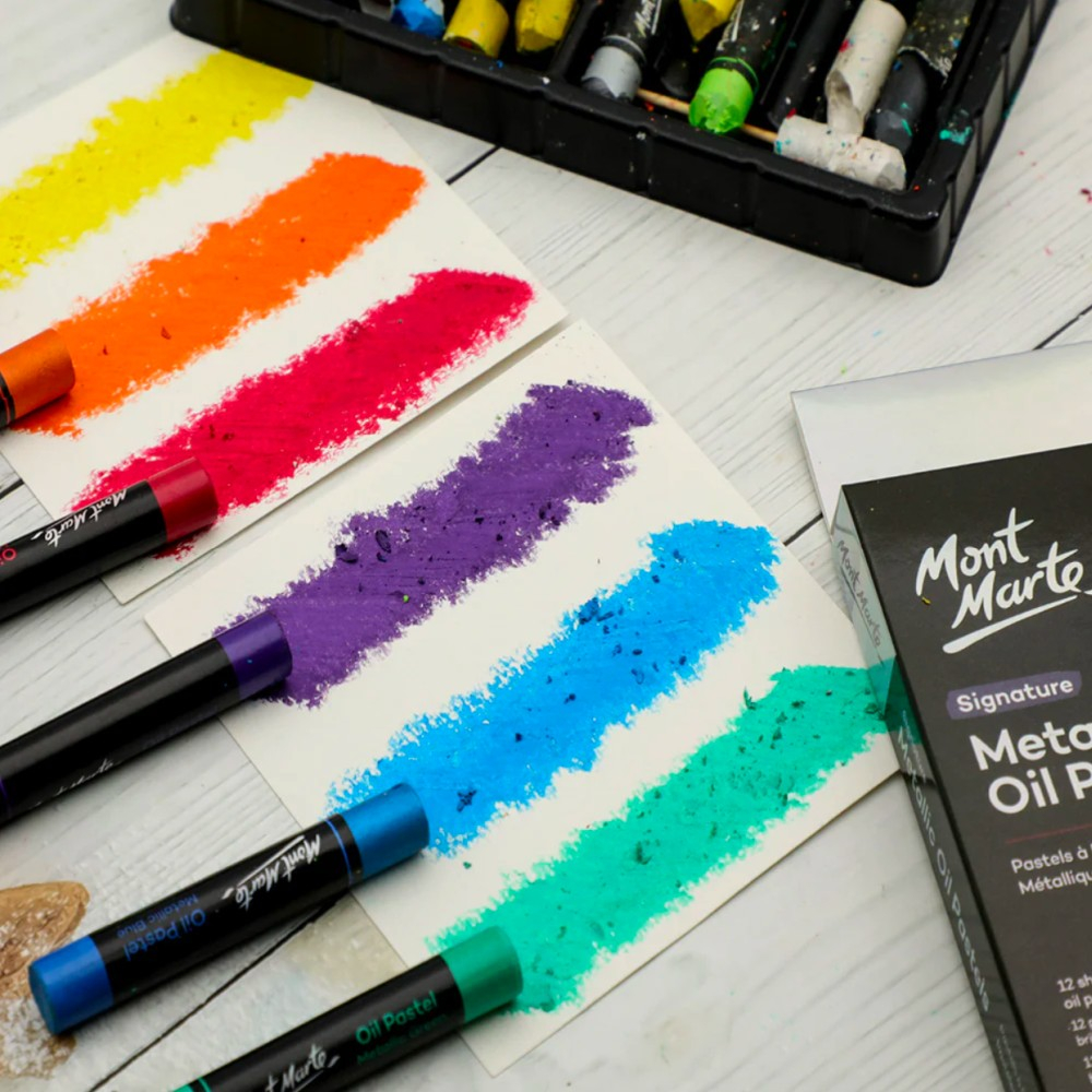 Adaugă un strop de strălucire lucrărilor tale cu Setul de pasteluri ulei metalice Mont Marte Signature.