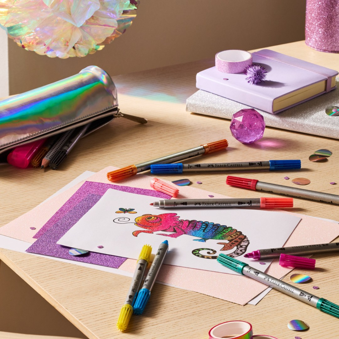 Setul de carioci Faber-Castell Glitter (10 culori) oferă desene strălucitoare și creative, datorită efectului de sclipici și culorilor vibrante.
